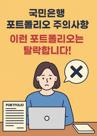 국민은행 채용에 마케팅, 개발, 서비스, 금융 등 다양한 배경을 가진 지원자들이 도전합니다. 하지만 국민은행 포트폴리오에 IT 공모전, 영상 제작, unrelated 공모전 수상 내역을 단순 나열하면 감점 요소입니다. 금융권 포트폴리오는 ‘은행 직무와 연관된’ 프로젝트 위주로 구성해야 합니다.