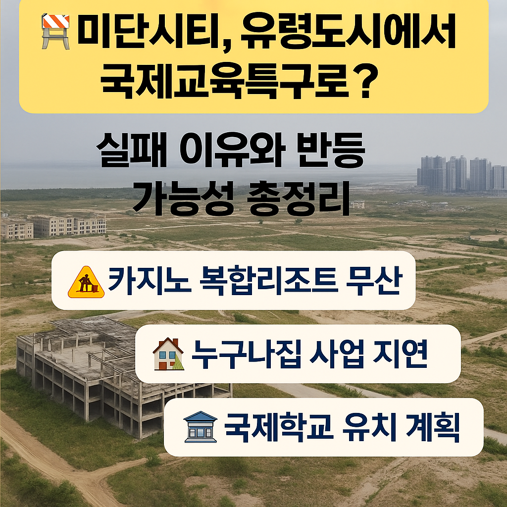 인천 영종국제도시에 위치한 ‘미단시티(Midan City)’는 한때 대한민국 최대 규모의 관광·복합개발 프로젝트로 기대를 모았으나, 장기간 공사 중단과 개발 무산으로 인해 ‘유령도시’라는 오명을 써야 했던 지역입니다. 그런데 최근 이곳에 국제학교 유치 및 재개발 가능성이 제기되면서 다시금 투자자와 실수요자들 사이에서 주목을 받고 있습니다.